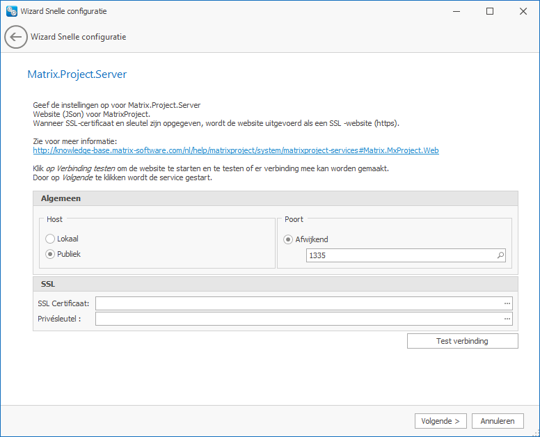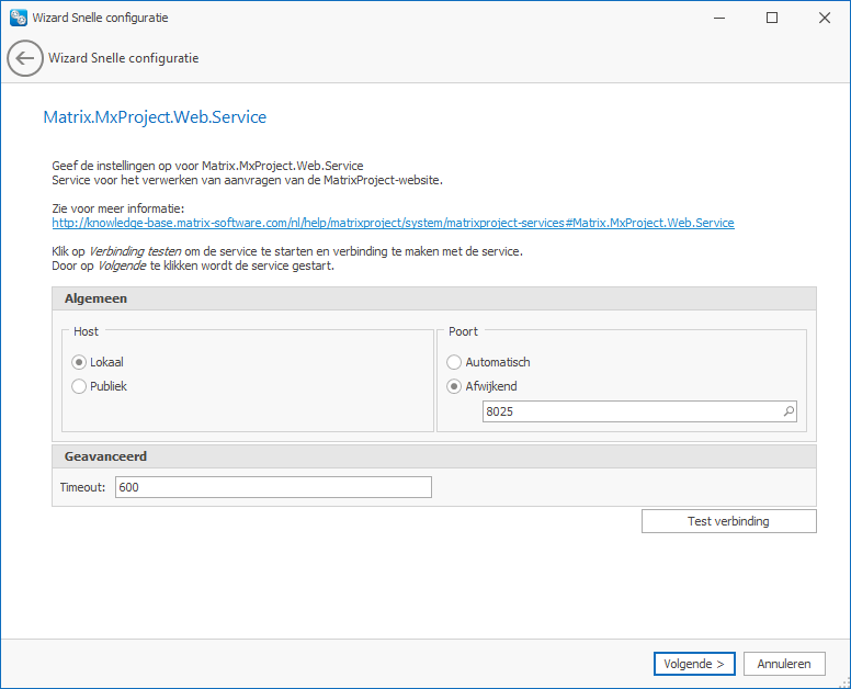 De host waarop de Matrix.MxProject.Web.Service service bereikt kan worden. Er kan gekozen worden voor: