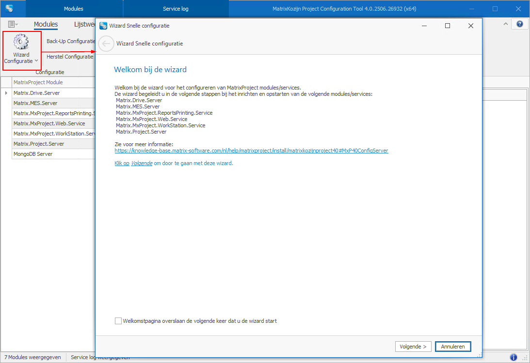 Vanaf MatrixProject 3.0 Service pack 2 is er een Configuratie Tool beschikbaar om de service in te richten, te starten en de logs te bekijken.