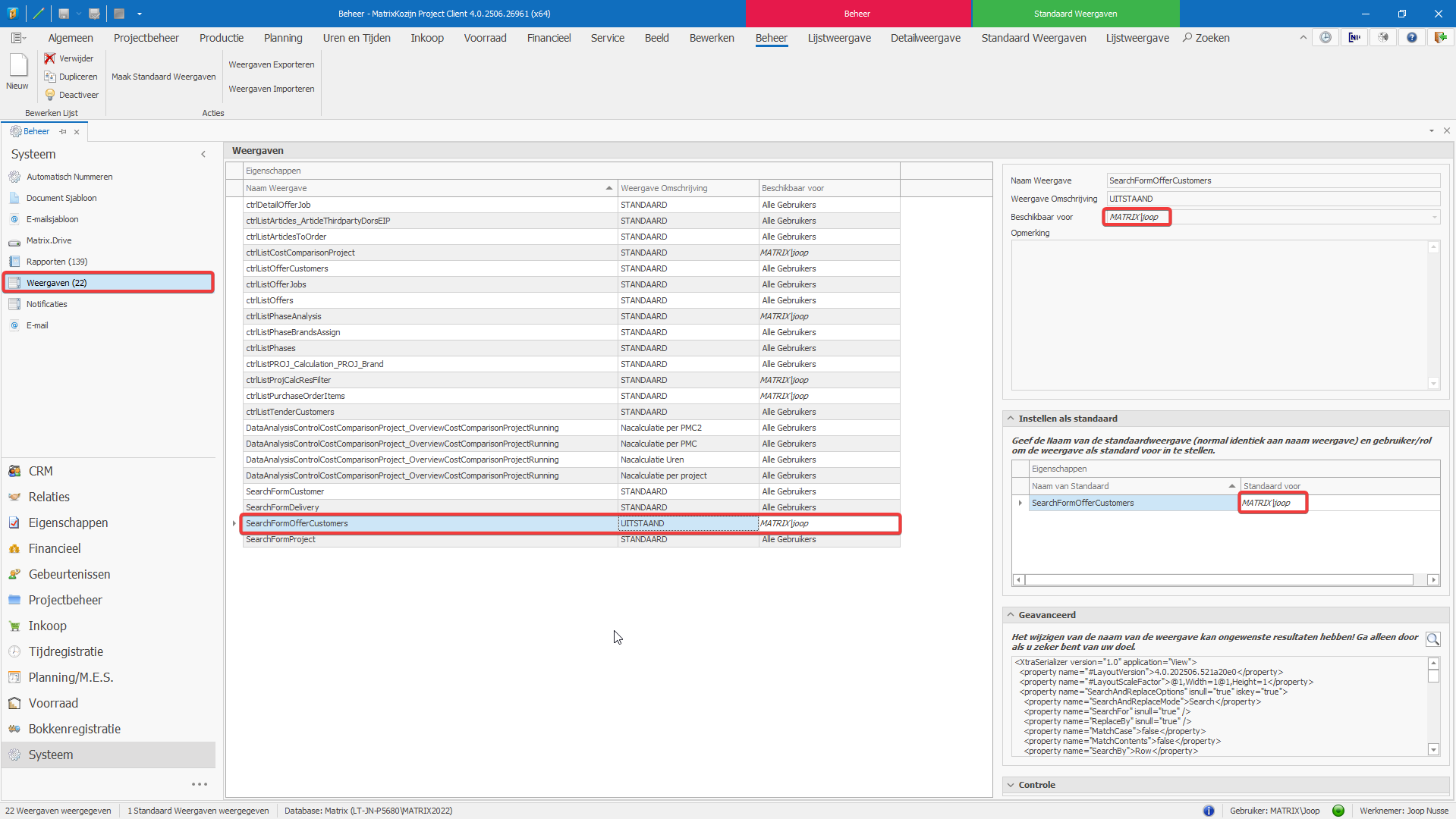 Onder weergaven worden alle in MatrixKozijn Project opgeslagen schermweergaven als bestand getoond. Hier kan nog geregeld worden of een bepaalde weergave voor 'iedereen' beschikbaar moet zijn en welke weergave standaard getoond moet worden.